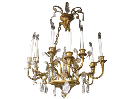 An elegant, finely chased, bronze d'ore, twelve-light Louis XVI style, Continental chandelier, suspended by 3 bronze chains affixed to an eagle head canopy.