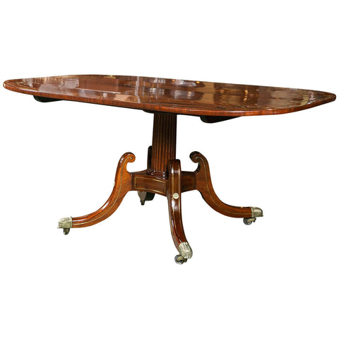 A single board crotch, flame, Caribbean mahogany brass inlaid Regency tilt top breakfast table. The rectangular top surmounts a reeded pedestal supported by four splay legs of swan neck form. All terminating on bronze caps and casters. Restoration to the top.