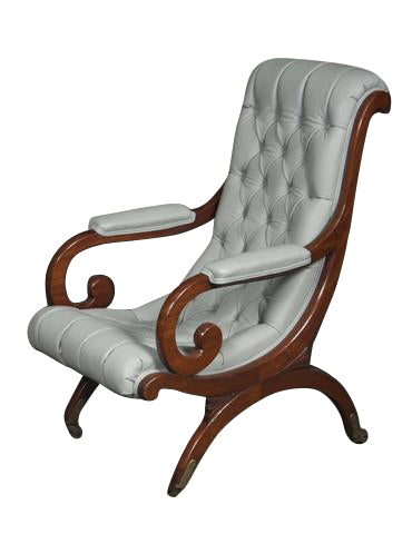 A mahogany Campeche or Plantation chair now reupholstered in leather; having original casters. Some repairs.