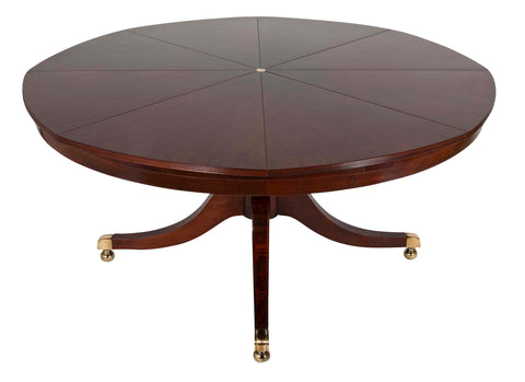 A mahogany Jupe style circular extension dining table having eight brass tipped extensions (leaves).