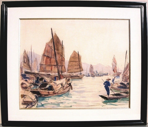 "Junks in Hong-Kong’s Harbor"Signed Maurice Menardeau, lower left Exhibition Tag from the renowned Cado Gallery, Avenue Foch in Paris Watercolor on wove paper – Excellent condition, no foxing, no molding, very good color retention Custom-made, handcrafted, modern frame and French mat with silver bevel Menardeau studied at the “Ecole des Beaux-Arts” of Paris under the tutelage of Charles Fouqueray, a famous Academic painter of navy scenes who transmitted to Menardeau his passion for the sea. In 1924, he discovered Concarneau, a beautiful harbor on the Brittany shore, which attracted “open-air” artists in love with seascapes from all other the world. Menardeau was held under Concarneau’s spell until his death. From 1925, Menardeau had been accepted to exhibit at the career-launching “Salon des Artistes Français” of Paris. He won the Mention of Honor in 1926 and became a member of the committee. His talent as a seascape painter and watercolorist was noticed and in 1936, he was appointed by the Ministry of the French Navy to be its official painter. An anchor next to the artist’s signature characterizes that distinction. That nomination led him to travel to South America, Northern Africa and the Far East: in Indochina, all under French control at that time. This work was made during the trip to Asia where he extended his visit to areas under other foreign domination. It is clear that this painting was not intended to depict any kind of Occidental supremacy. Menardeau dedicated this work to translate the poetic beauty of the Hong Kong Bay with the same sincere energy he did of Concarneau.
