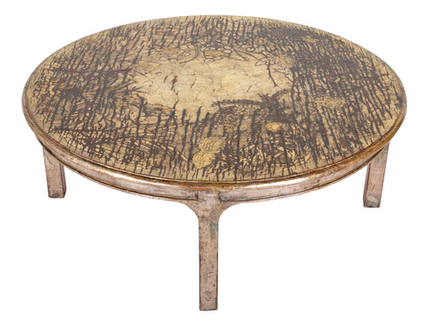 A Max Kuehne round silver leaf and polychrome wood coffee table.