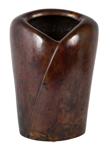 Misawa Hiroshi patinated brown bronze vase in stylized Kimono form with red Murashido motif. Signed. Japan. Mid 20th Century.