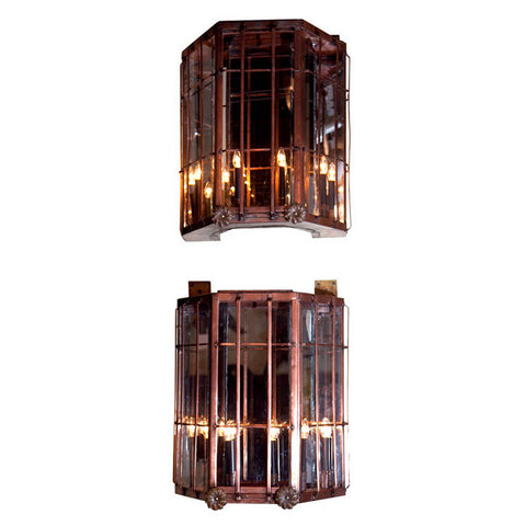 A late 19th Century monumental pair of paneled copper, mirror backed eight light sconces having five glass sides with copper grids from a Westport, CT waterfront estate.