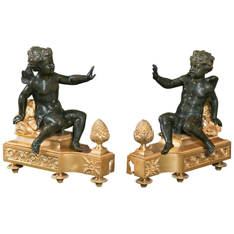 A monumental size & quality, magnificent pair of D'ore & patinated bronze French chenets depicting cupids.