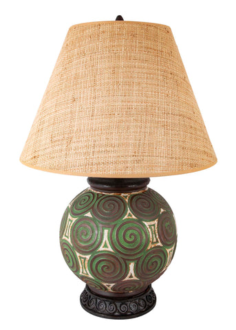 Mougin Art Pottery vase now a lamp with hand forged metal work by Louis Katona having spherical green and brown theme. Nancy, France. Circa 1920's.