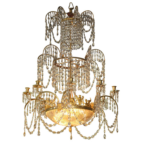 A stunning early 19th Century three tier Swedish Neoclassical d'ore bronze and crystal eight light chandelier. Excellent condition.