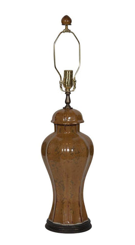 A glazed ochre jar with lid, mounted as a table lamp.