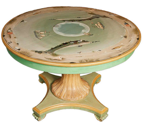 A round Regency style table (composed of some old elements) painted and signed by Ralph and Martha Cahoon showing scenes of Nantucket Harbor.