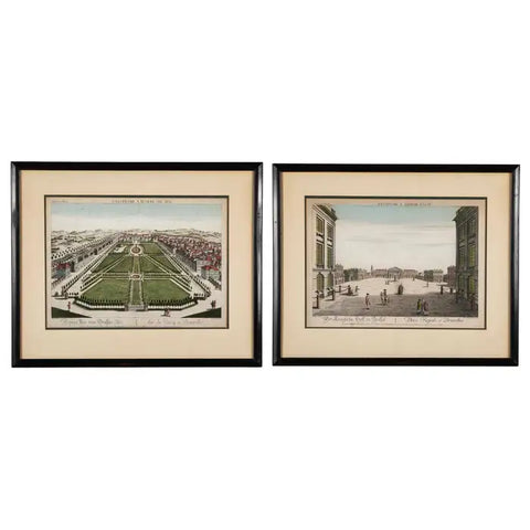 Pair of hand colored engravings of the Royal Palace and Brussels Park by Balthasar Friedrich Leizelt (also spelled Leizel, active 1750–1800) a German artist and copperplate engraver working from Augsburg. These are beautiful and evocative renderings of architecture, open space and perspective. Circa 1782.