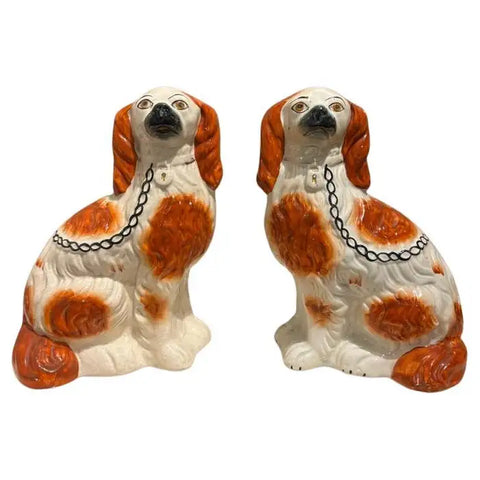 Pair of Antique English Staffordshire Glazed Ceramic Spaniels