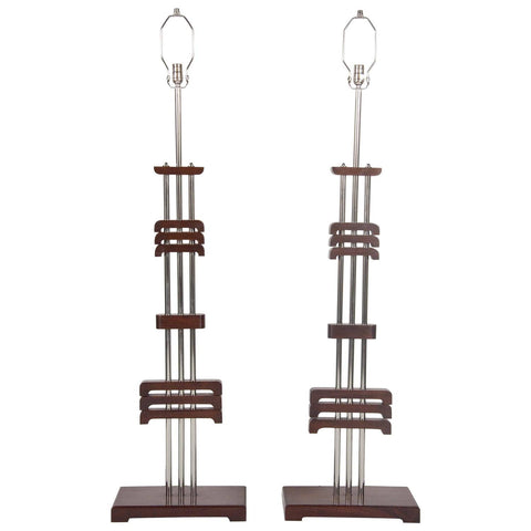 A fantastic pair of Art Deco floor lamps of polished stainless steel & black walnut; in the manner of Donald Deskey.