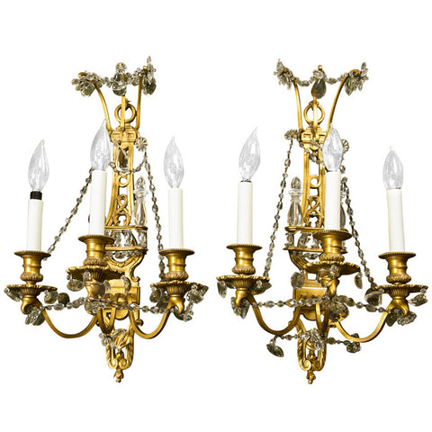 A pair of fine quality French bronze d'ore and crystal, three-light Bagues sconces. Circa 1900.