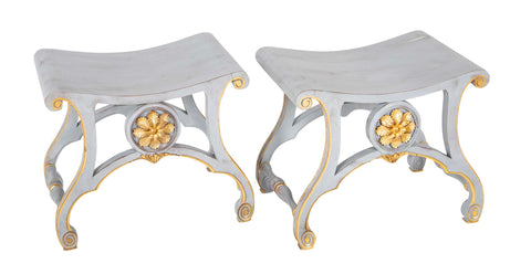 A pair of Chippendale style painted and gilt trimmed scroll leg benches with saddle seats and gilt floral leaf rosettes.