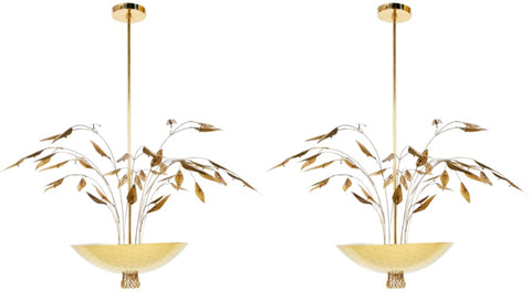 Custom enameled brass chandeliers having leaf motif design in the manner of Paavo Tynell ( Finland 1890 - 1973 ). 20th Century.