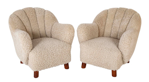 A pair of Danish sheepskin armchairs in the manner of Fritz Hansen. Circa 1930's. Newly upholstered.