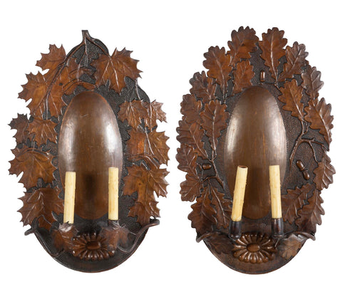 Pair of Dutch Baroque style copper repousse sconces with oak and maple tree motifs. Mid 29th Century.