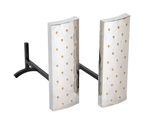 Pair of French 20th century andirons having white metal panels with applied Fleur-de-Lis decoration.