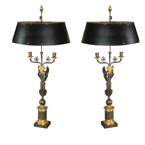A pair of gilt and patinated French Empire style 2 arm candelabra mounted as lamps with winged classical figures and tole shades.