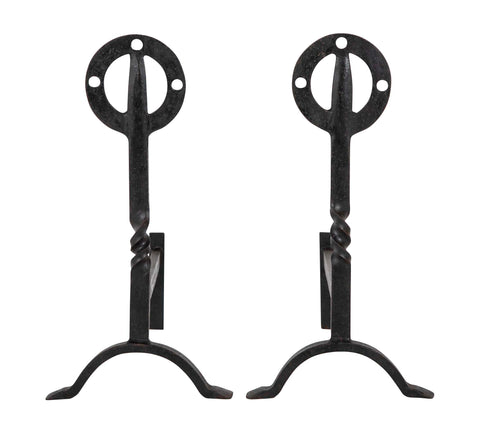 Pair of Glasgow School iron twisted column andirons with circle at top. Scotland. Circa 1900.