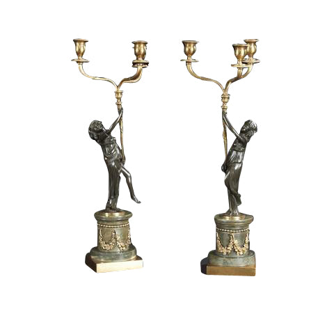 A pair of Louis XVI patinated bronze figural candelabra on bronze mounted marble bases. France, early 19th Century.