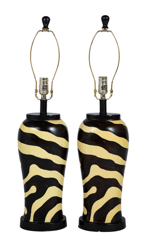 Pair of Mid-Century Zebra Decorated Lamps with Matching Finials