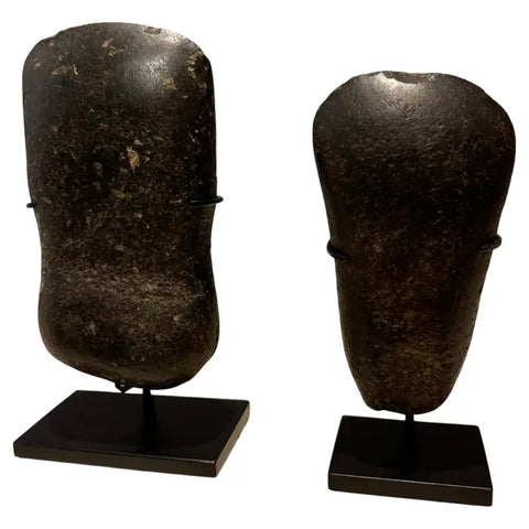 Two Black Basalt carved and polished Neolithic axe heads mounted on steel bases. These wonderful ancient objects are a testament to the artisans who created them, with the edges still sharp after 4000 years. These are beautiful and evocative pieces of sculpture.