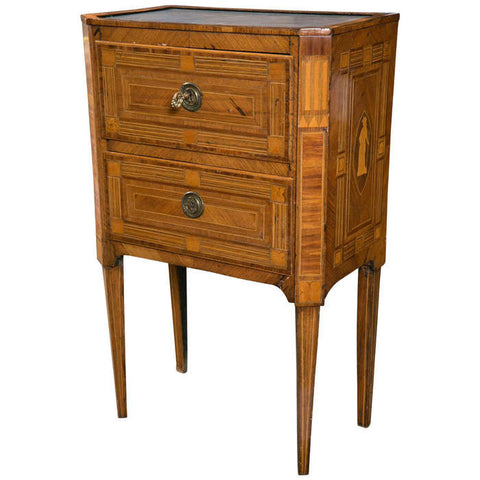 A pair of Bleu Turquin marble top inlaid Italian Neopolitan two drawer Neo-Classical commodini.