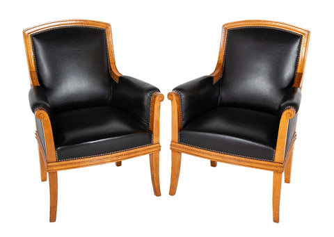 Pair of oak armchairs with black leather upholstery by Louis Sue for Lazard Freres Banque. Circa 1940. France.