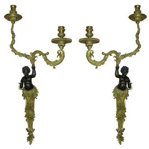 Left and Right set of four French Regence gilt and patinated bronze putti sconces.