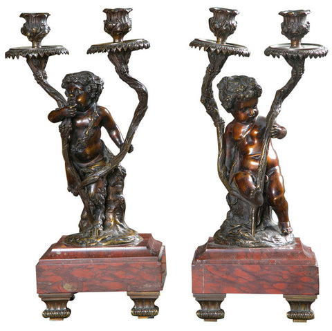 A pair of French Rococo style candelabra after Claudion. Bronze set upon rouge marble base.