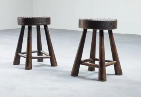 A pair of tapered leg Oak stools with leather seat pads and brass nail heads.
