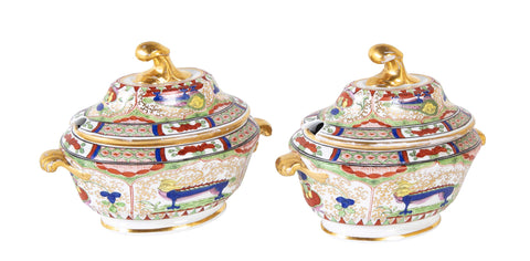 Pair of Worcester "Dragons in Compartments" Covered Sauce Tureens