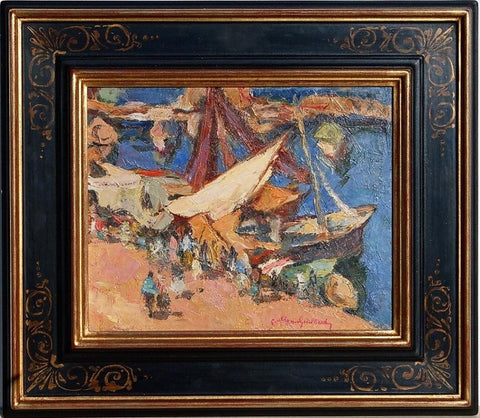 PAUL LOUIS GUILBERT (French Born in 1886) Le Port de Collioure (The Harbor of Collioure, FRANCE) Circa 1920 Signed Paul Louis Guilbert lower right Oil on canvas Excellent condition 22 x 27 cm 8 3/4x 10 5/8 in 35,5 x 41 cm with frame 14 x 16 in Beautiful custom-made, handcrafted Italian Renaissance style frame from the renowned Parisian framing house Rue Bonaparte A self-taught painter, Guilbert devoted himself to his art from 1923. He had a successful career as a landscape painter. From 1925, he exhibited at the highly regarded and avant-garde salon des Ind̩pendants of which he became a member of the Jury. The artist was a romantic storyteller and his paintings are extremely detailed even with his thick brushwork and impasto. Guilbert travelled in Spain and Italy from where he brought back witty and colorful harbor views and shore scenes. Literature: - Benezit: Dictionnaire des Peintres, 1999 - Wolpert & Winter: Figurative paintings, Paris and The Modern Spirit, Atglen, 2006