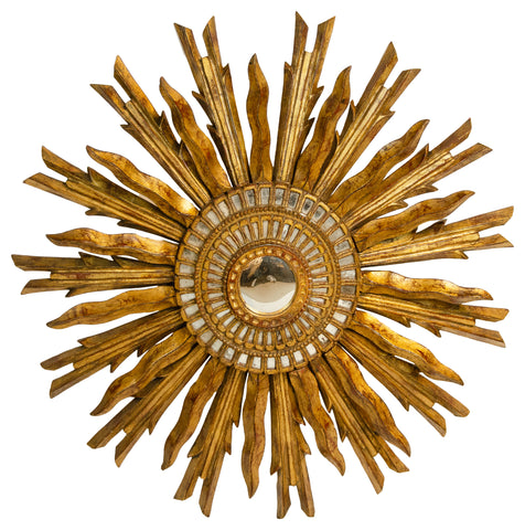 Dramatic sunburst mirror, the gilt wood carved frame of rays surrounding progressive borders of small mirror panels to a concave bullseye mirror.
