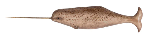 A plaque of a carved and painted narwhal by Roger Mitchell.