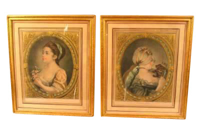 A pair of 18th century framed and matted colored etchings of two women from drawings by Greuze.