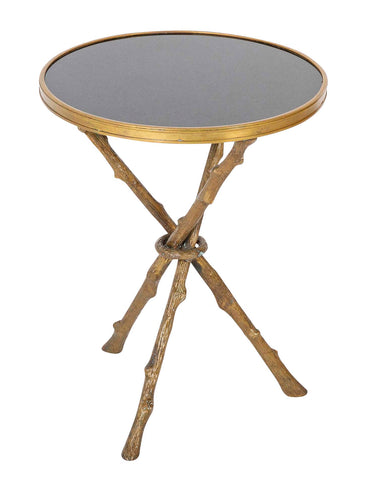 Regency style side table with round polished black granite top over bronze tripod 'faux bois' legs made to resemble tree branches. A very handsome and elegant side or drinks table suitable for both modern and traditional rooms. Beautifully made and quite sturdy. France. Circa 1970's.