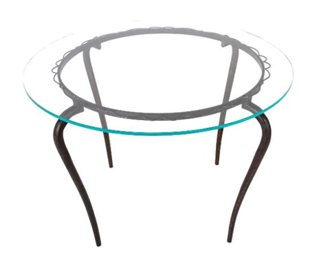 Rene Drouet ( 1899 – 1993 ) round glass topped table with 4 legged iron base & ‘petal’ addition to supporting ring.