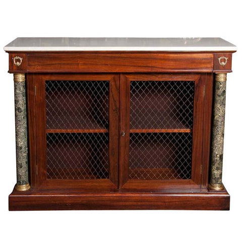 An English rosewood Regency credenza with bronze grill doors, faux marble scagliola columns and original white marble top.