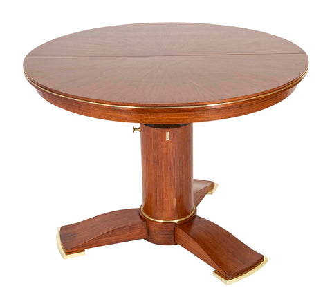 Round brass bounded table having two additional leaves and elevation system by Jules Leleu (1883-1961).