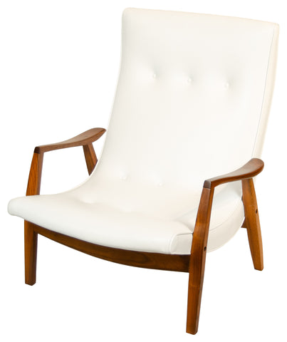 Classic high-back low-slung scoop chair designed by Milo Baughmann for Thayer Coggin. The white vinyl and joined wood in excellent condition. Circa 1950's.