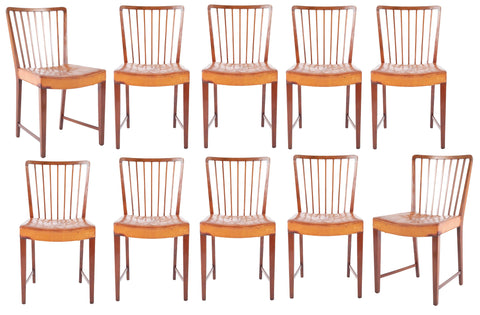 Set of 10 Fritz Hansen stained beech dining chairs having original "Niger" leather upholstered seats. Some with splits & tears in keeping with age. Note : price reflects the condition. Model 1666. Marked 1940's. Denmark.