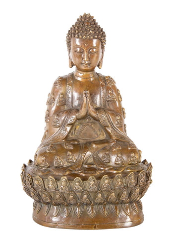 A Chinese sculpture of a buddha having held hands to express gratitude, devotion or as greeting. Signed.