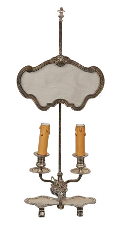A Louis XV silvered two-light table lamp with an adjustable shade and tray-form base.