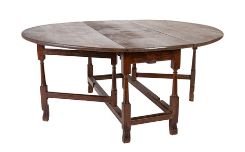 William and Mary Period "Spanish Foot" walnut gate leg table with six legs and rounded leaves and single drawer having rose head nails. Remarkable original condition. Circa 1710 - 1720.