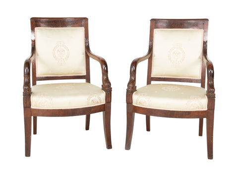 Pair of carved Cuban mahogany dolphin arm Charles X fauteuils. Circa 1840.