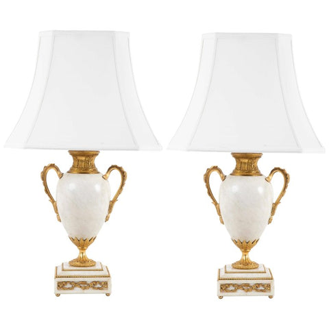 Pair of Louis XVI style ormolu mounted lamps with baluster form white marble vases on square marble base. 19th century.