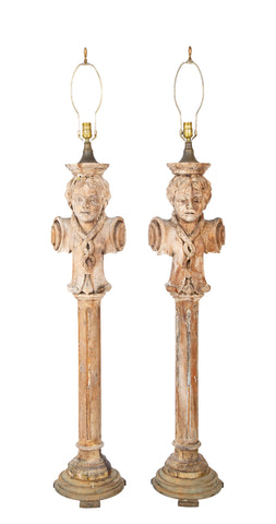 A pair of French 19th century wooden column floor lamps with carved bust at top of column. Late 19th century.