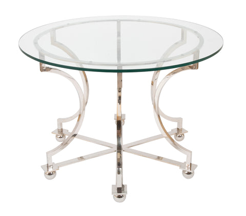 Highly polished silver metal base glass top table possibly Maison Jansen